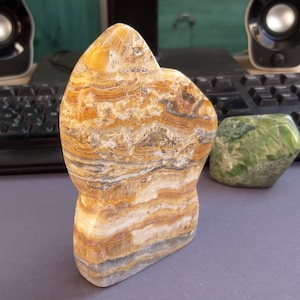 This blue aragonite slice is polished and shaped by hand as a self-standing mineral freeform. It contains interesting druses and small geodes. Its shape is elegant and size of 17cm is good for a display on the shelf. Blue aragonite is a rare mineral and because the slab is handmade its also unique.