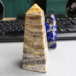 Check out this stunning tower of natural lazurite, pyrite and quartz. Its three sides are polished and the front size is raw so you can see all of the minerals in their natural state. Not to mention that it makes the tower unique and interesting. Lazurite is a rare deep blue mineral. Pyrite - so called fool's gold - shines with its lovely golden color and light gray quartz creates a dynamic contrast to a dark lazurite. This obelisk is simply perfect. Only one is available so don't hesitate.