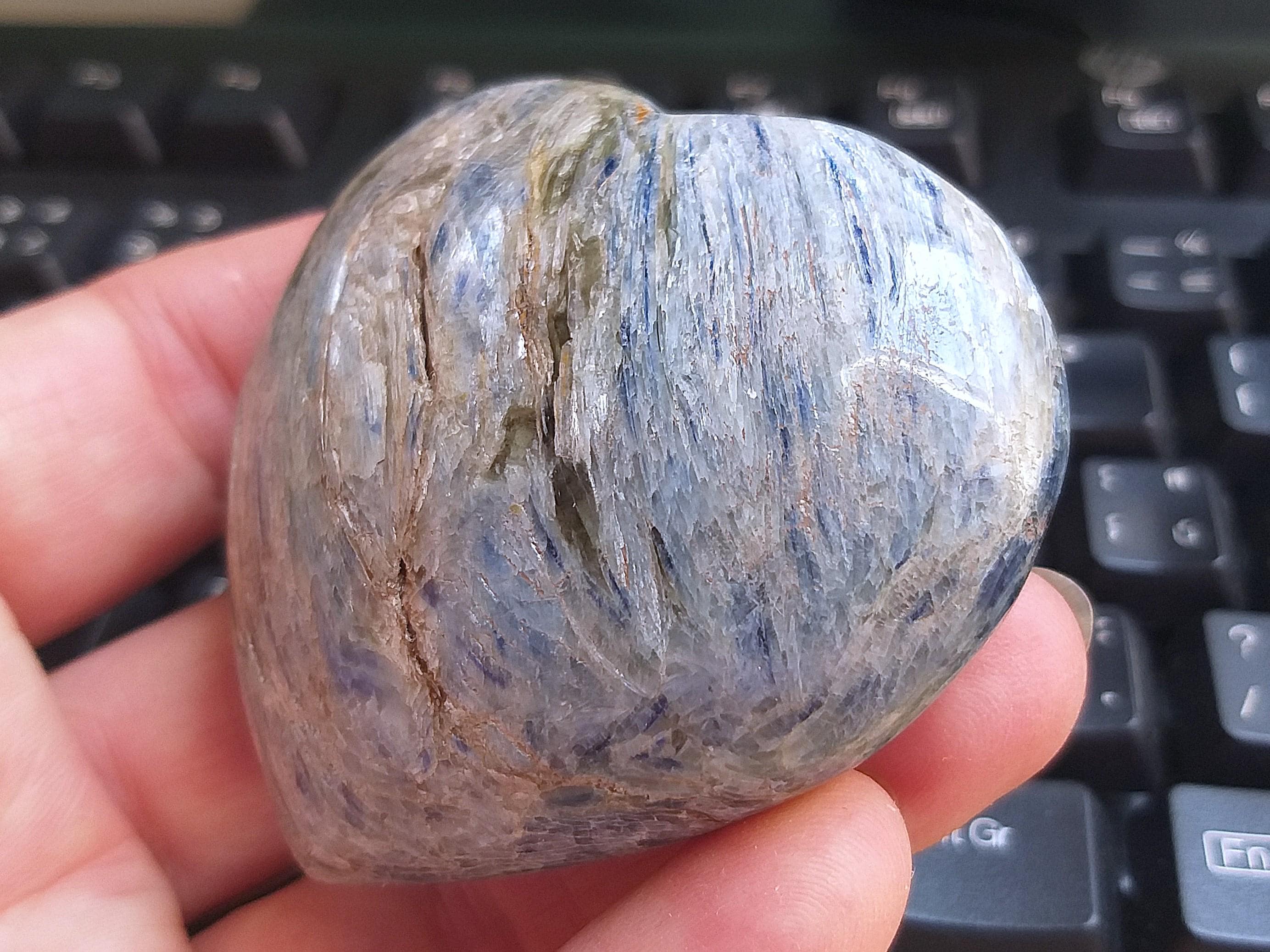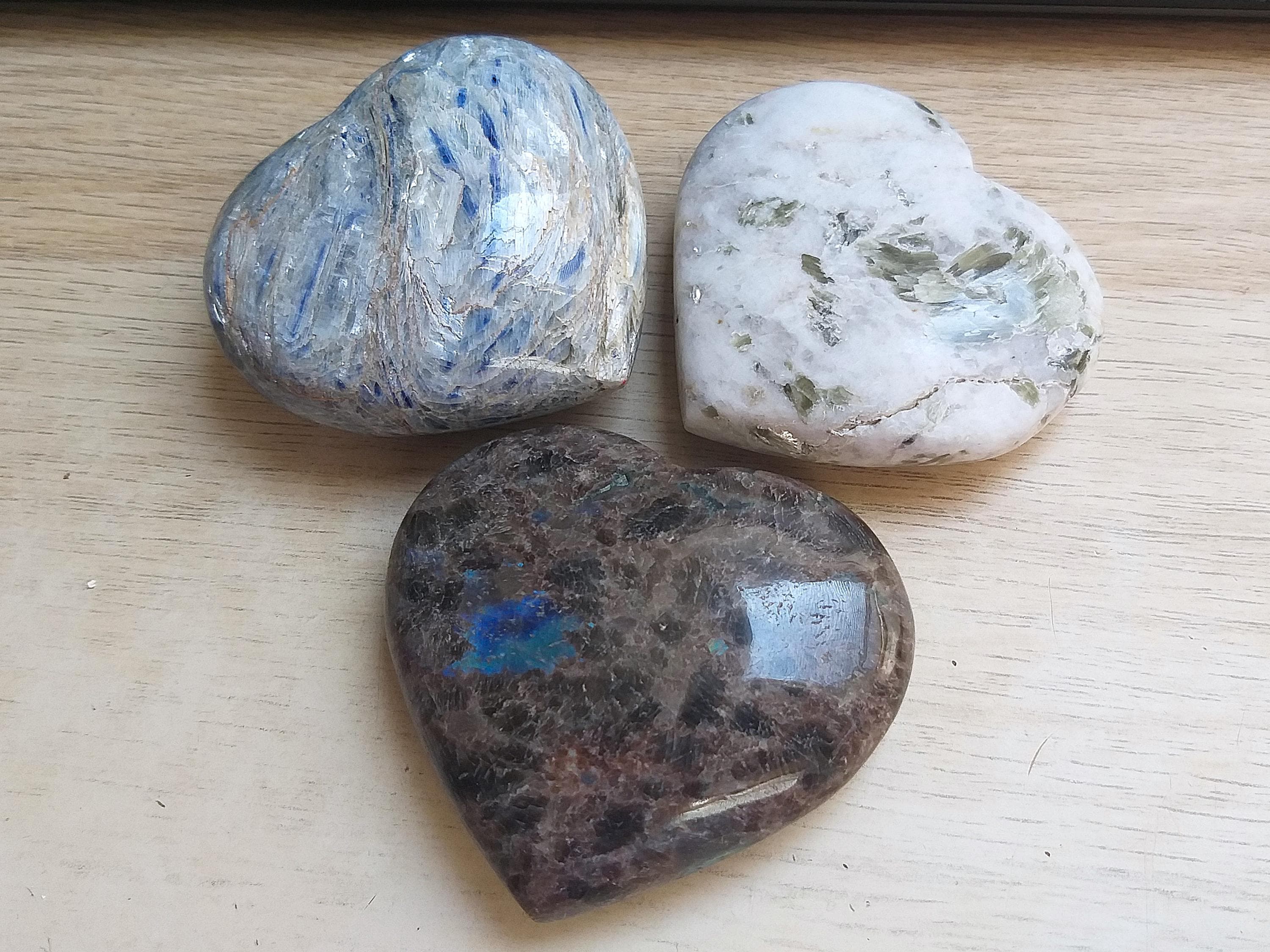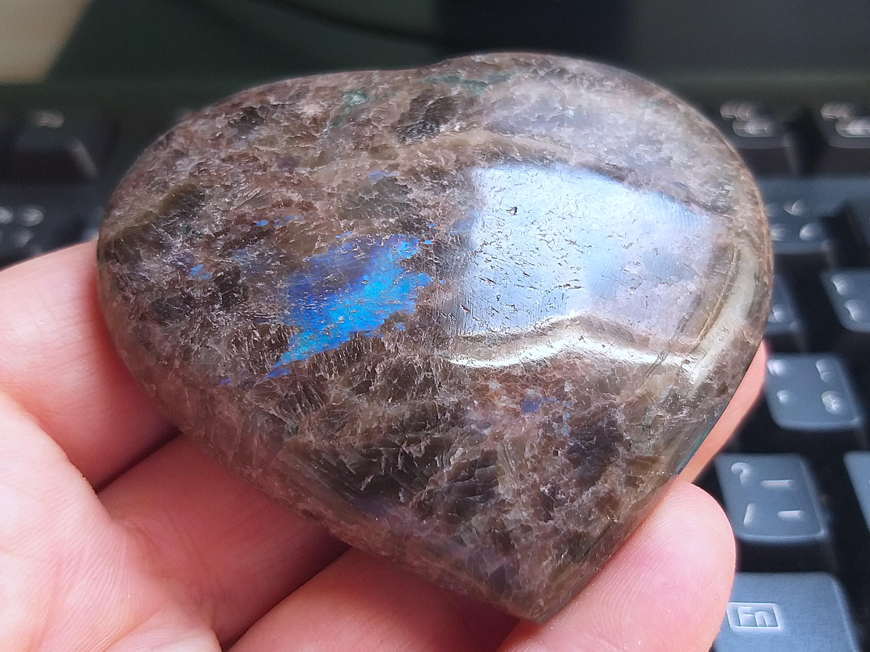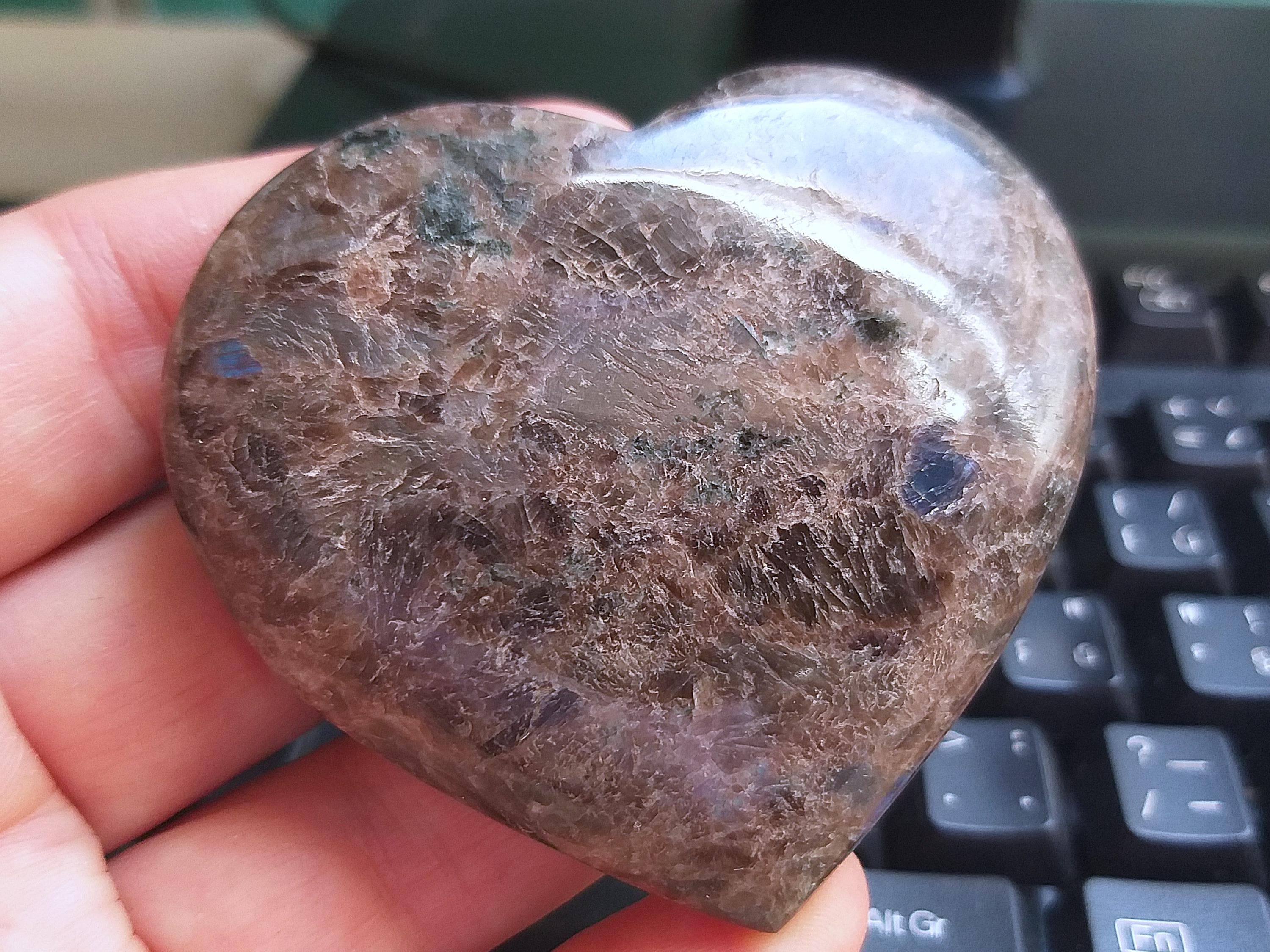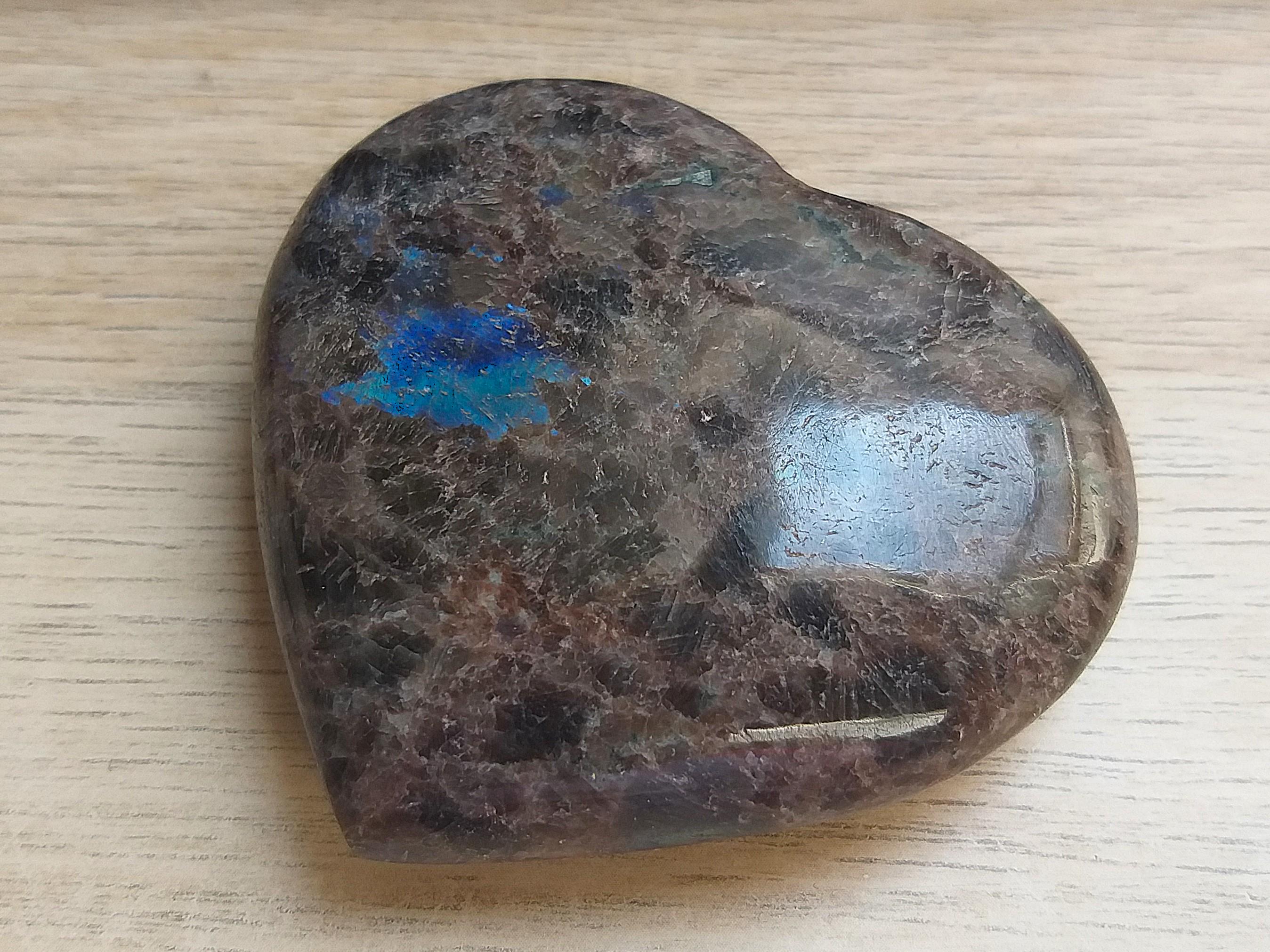💗 Pink Larvikite (Norway) A soft blush in a stone known for stormy greys. This heart gleams with deep blue iridescence, like labradorite seen through rose-tinted mist. A grounding companion for inner vision.