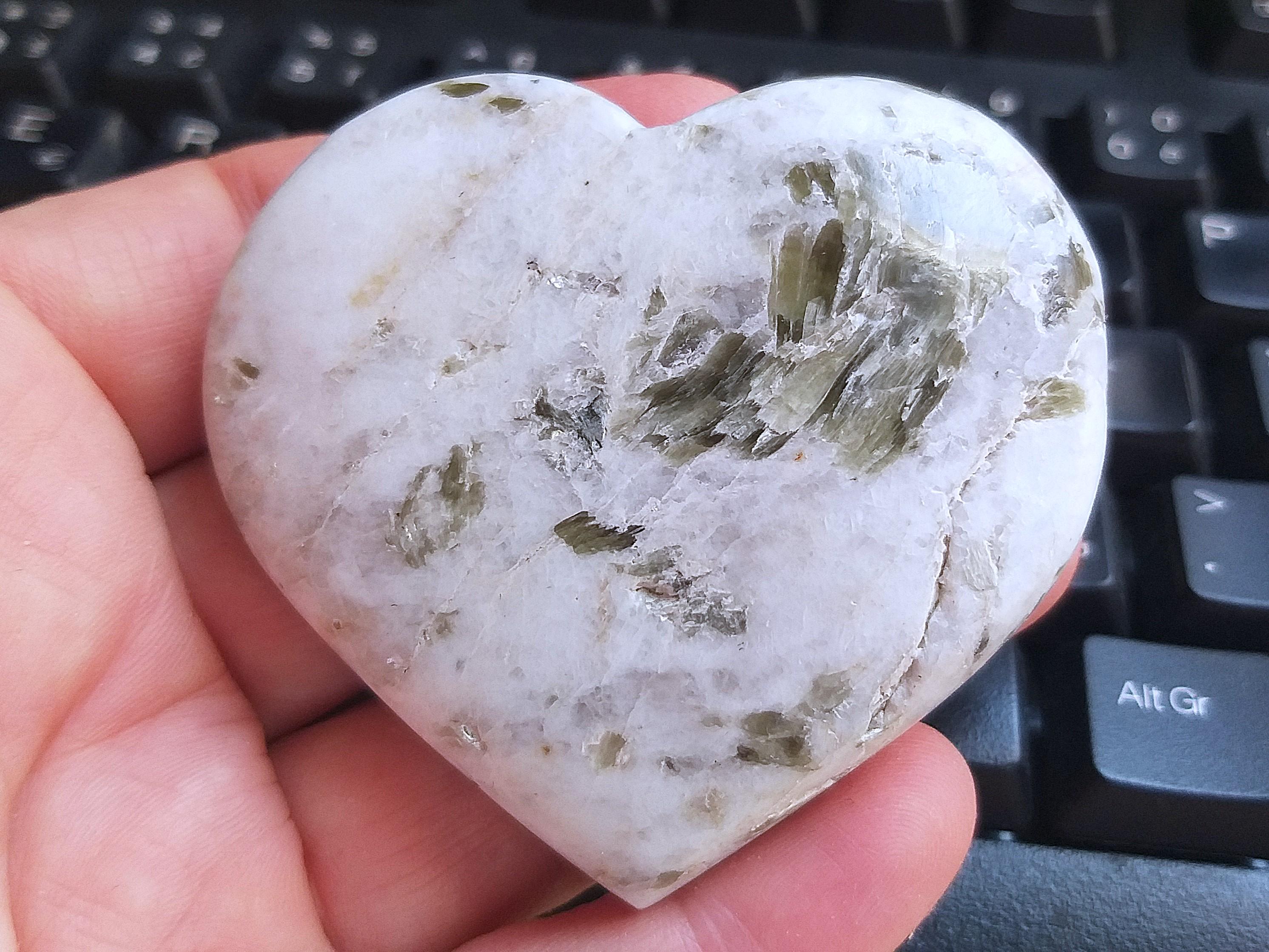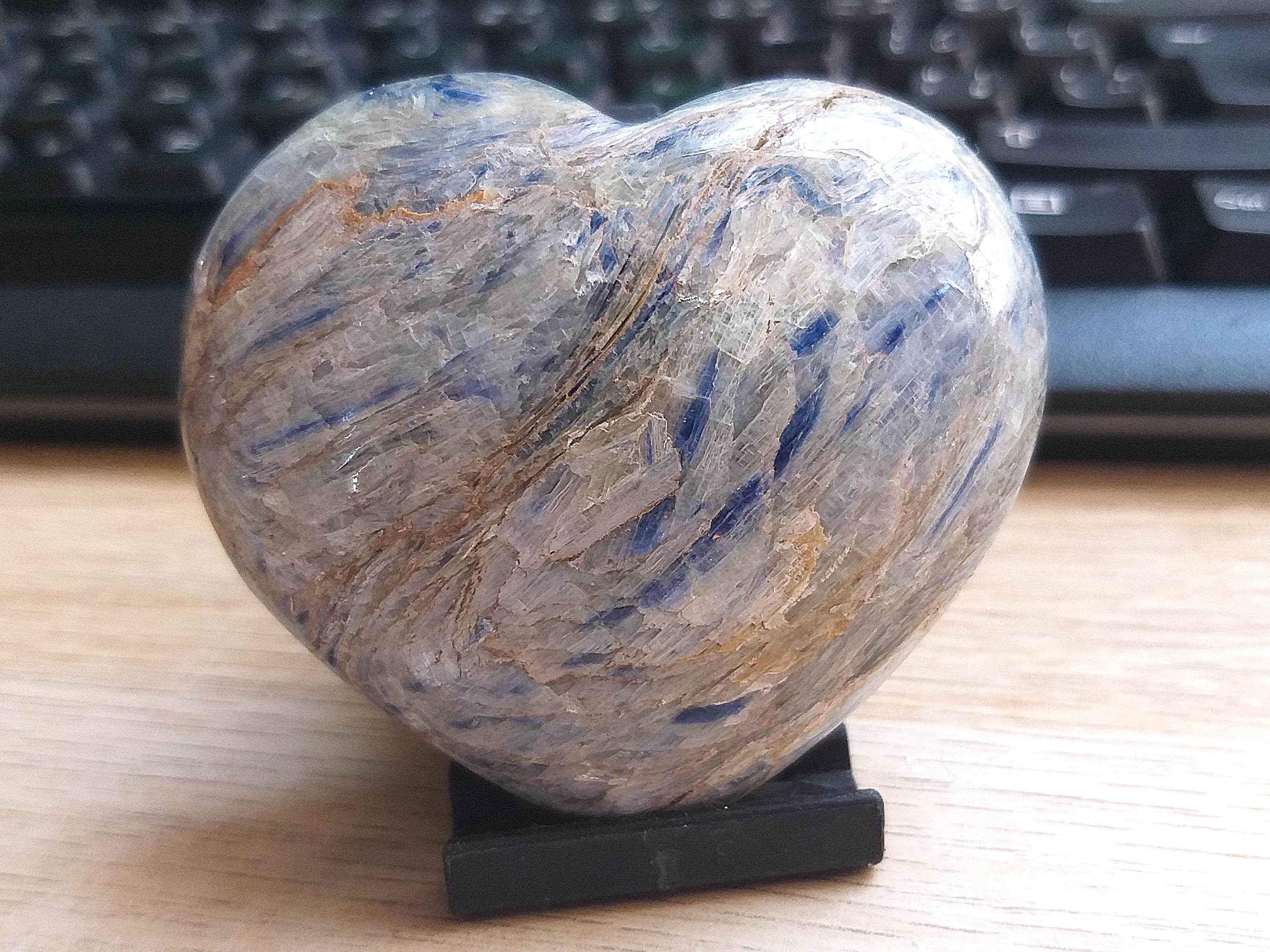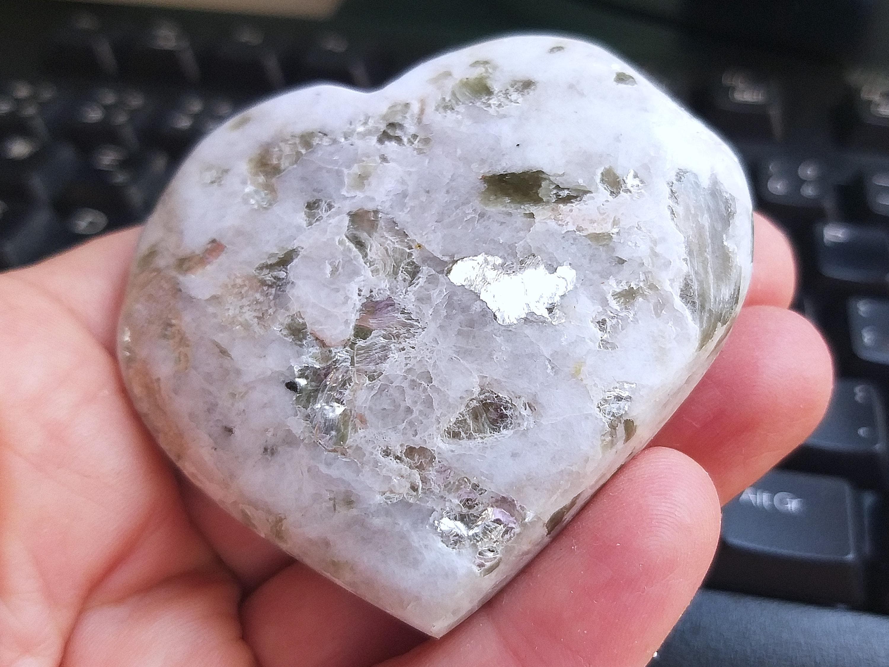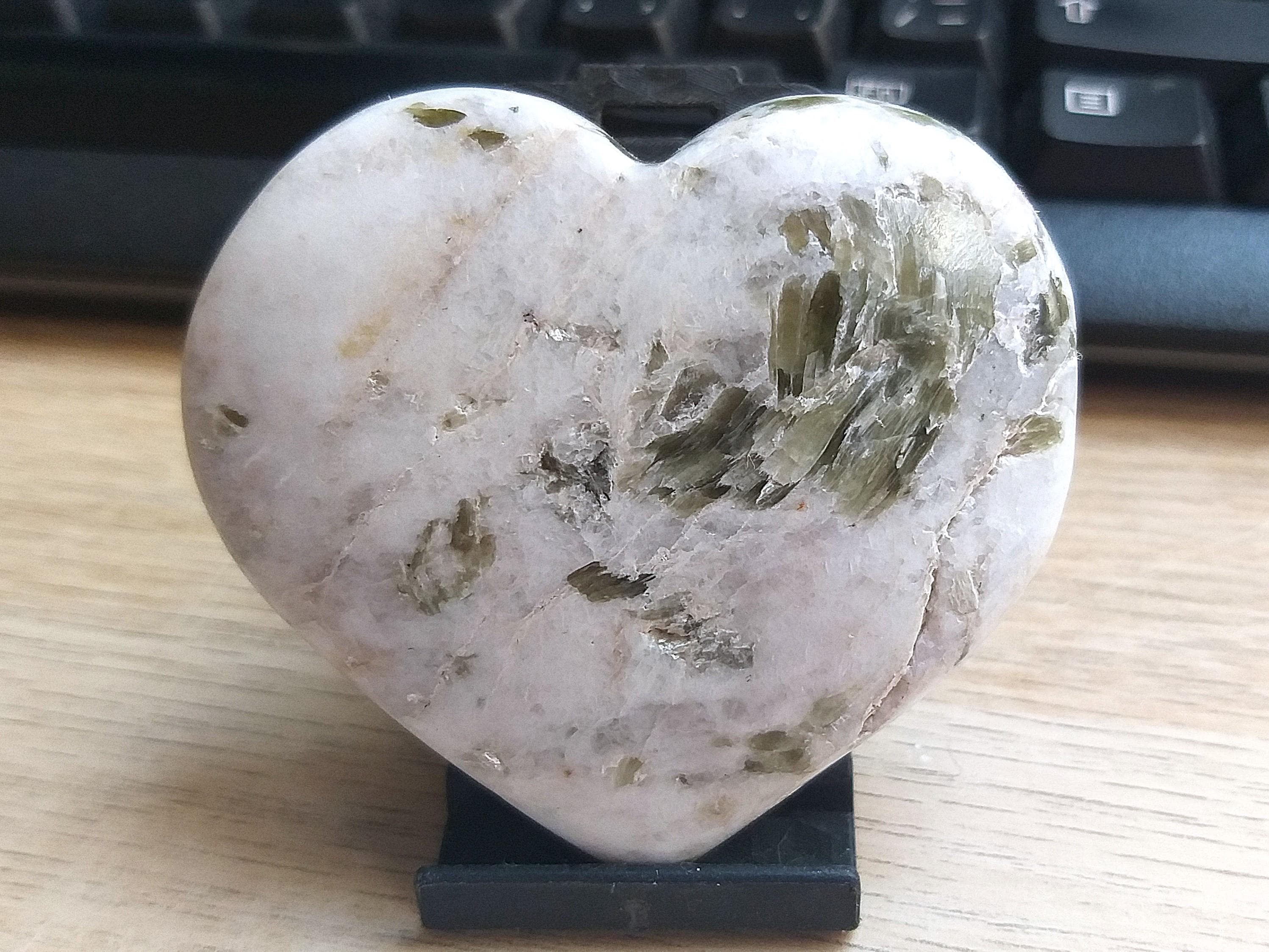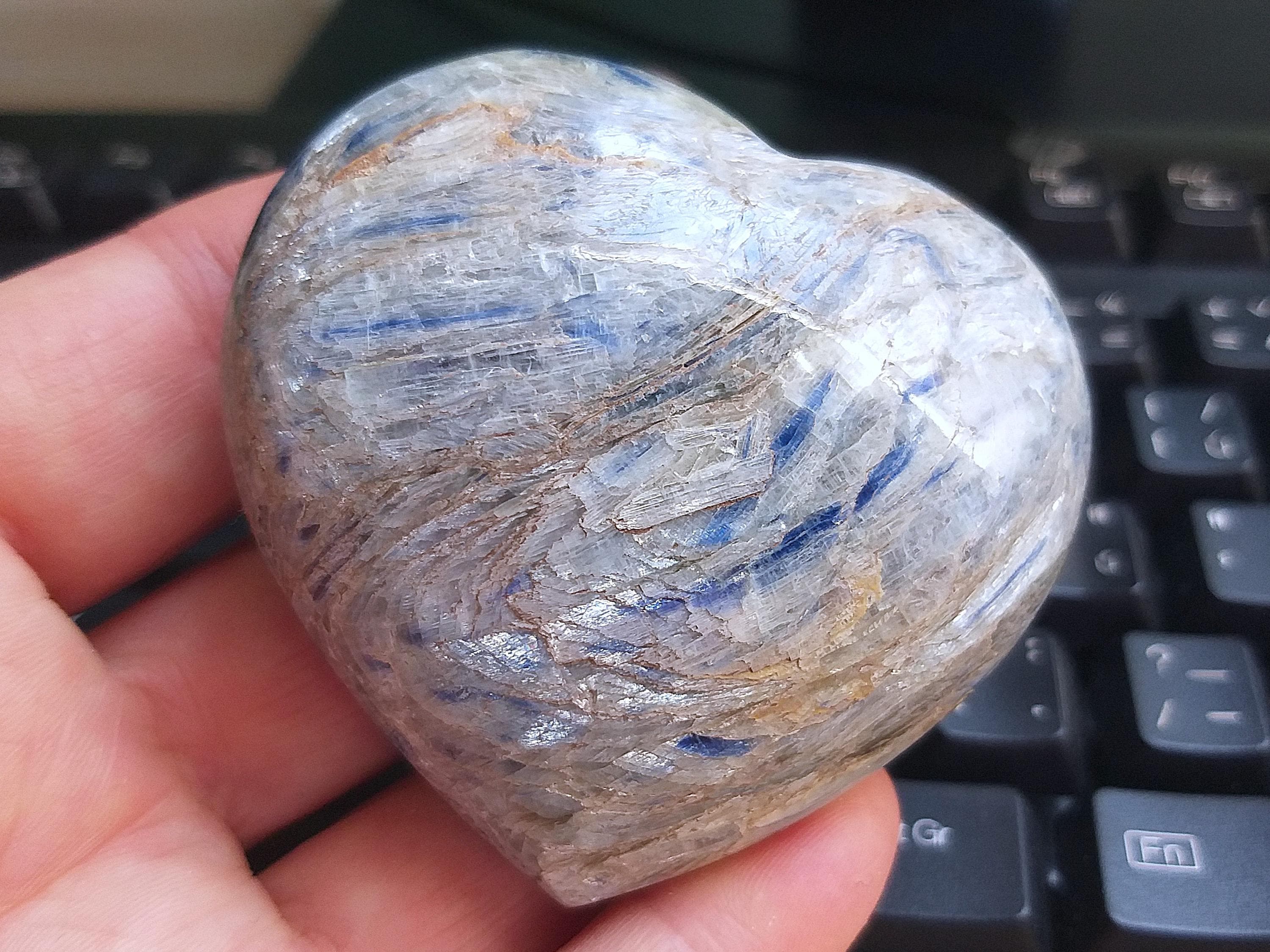 💗 Pink Larvikite (Norway) A soft blush in a stone known for stormy greys. This heart gleams with deep blue iridescence, like labradorite seen through rose-tinted mist. A grounding companion for inner vision.