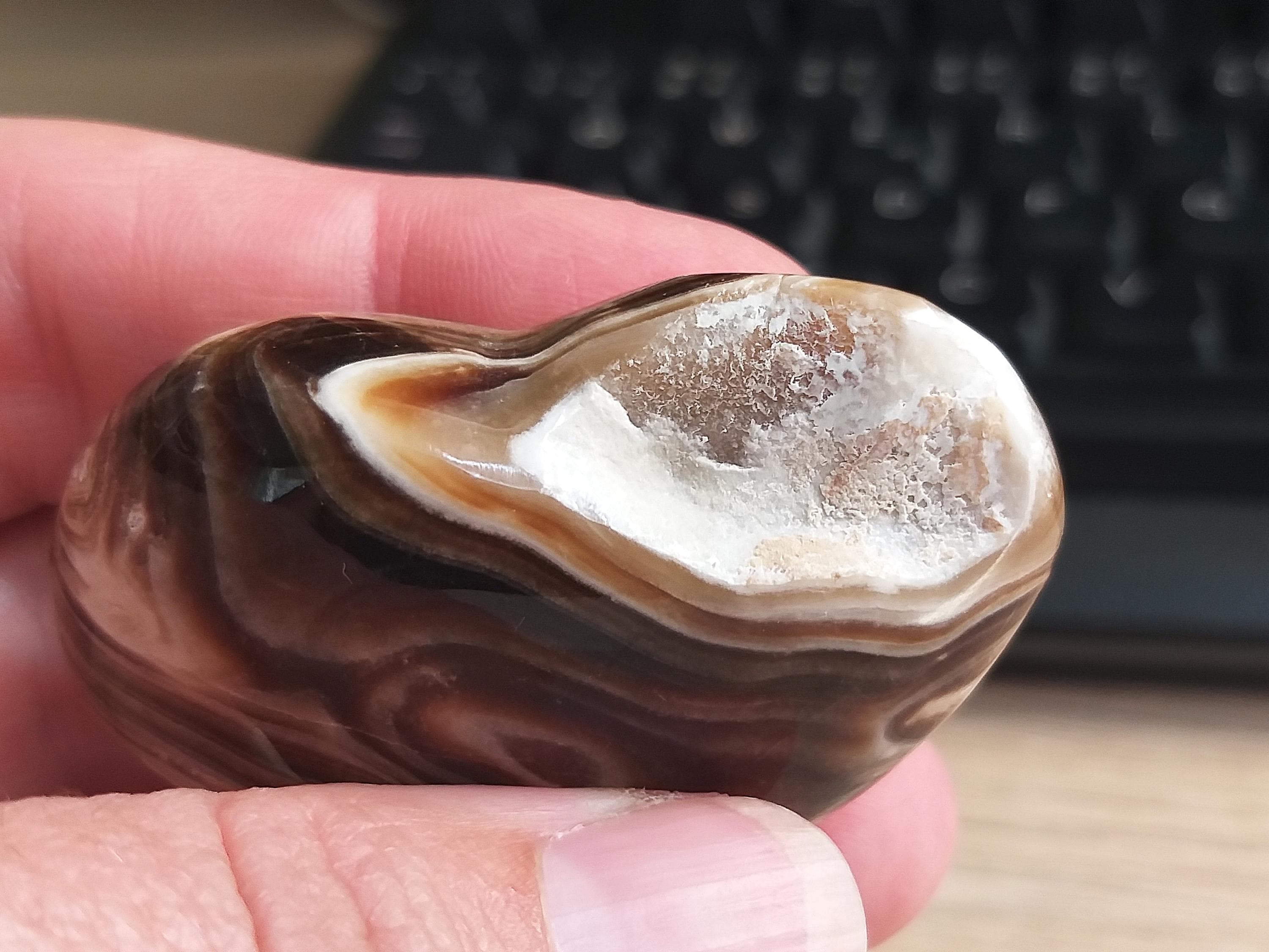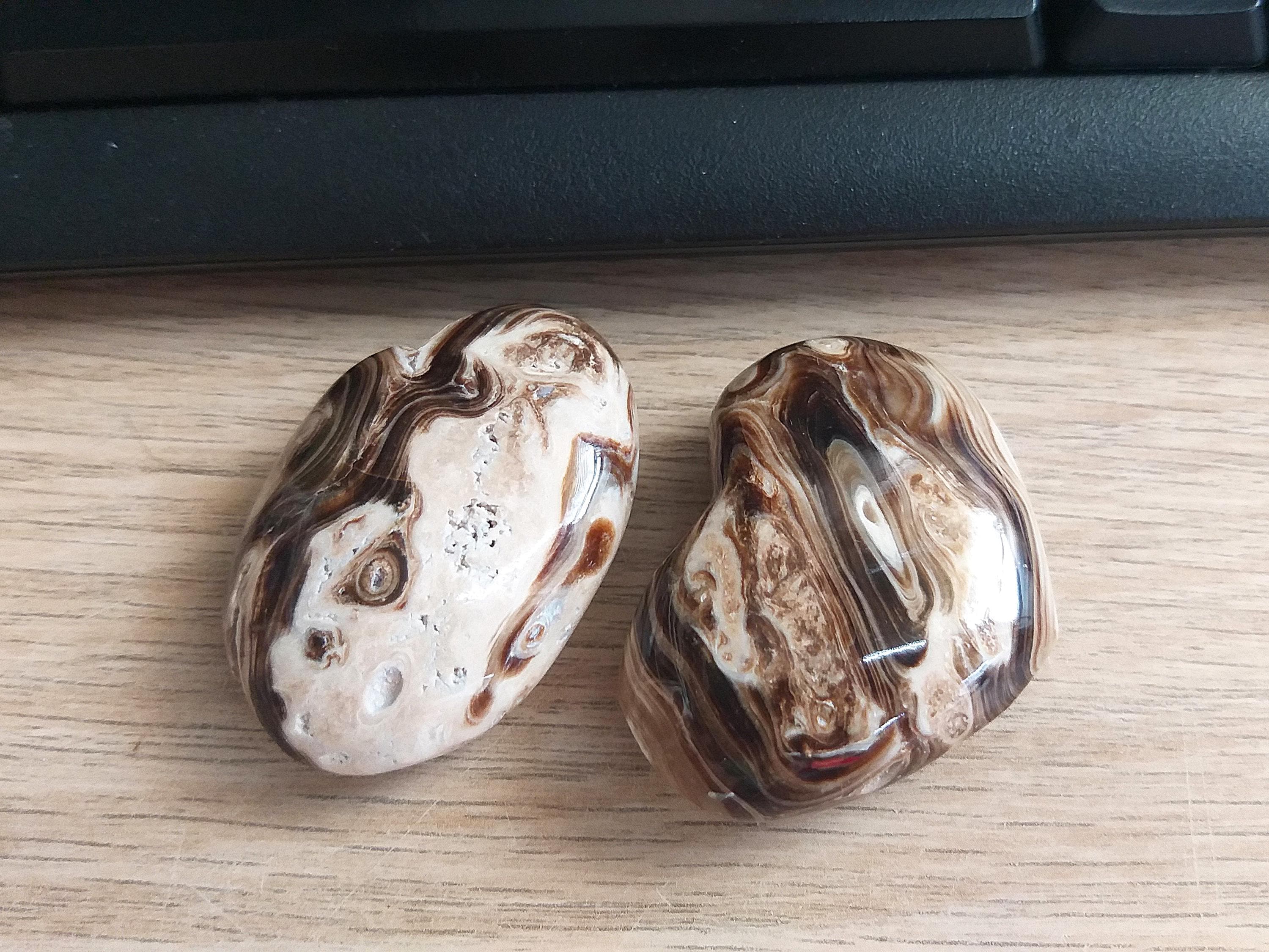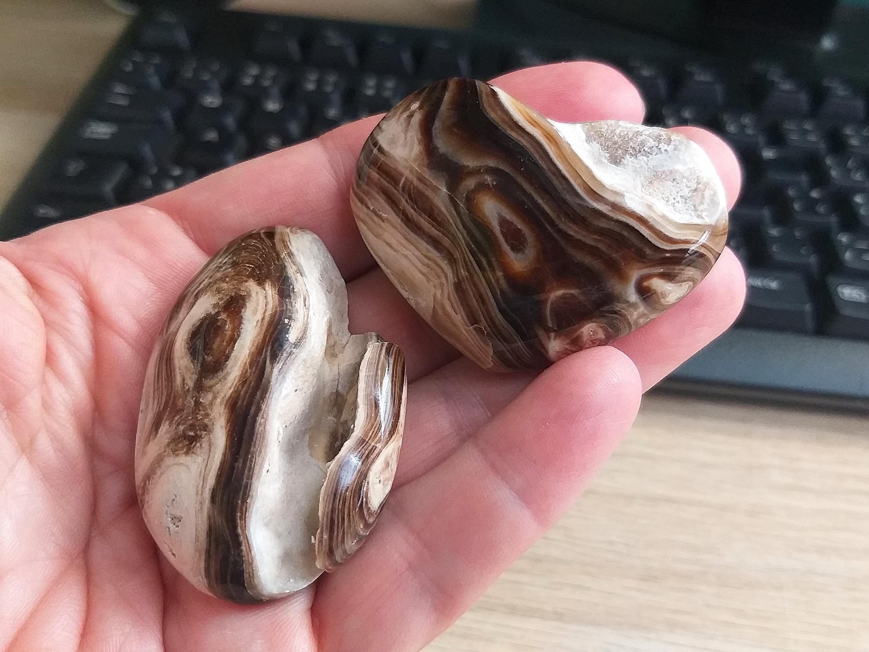 🍫 Chocolate Calcite (Pakistan) Swirled with waves of light and dark cocoa tones, these stones shimmer with natural druses and geodes. Their polished surfaces contrast beautifully with raw crystalline pockets, offering both tactile delight and visual depth.