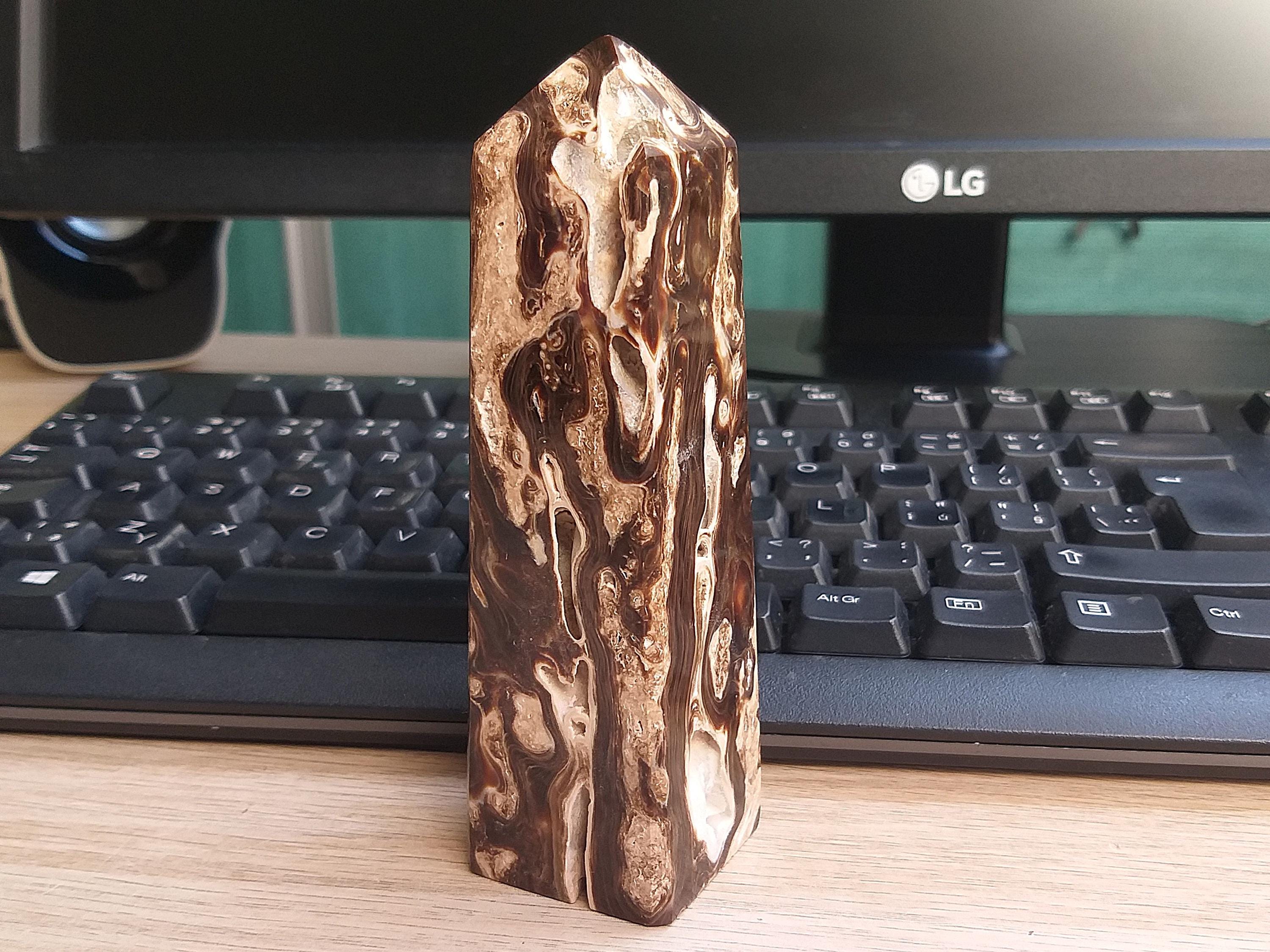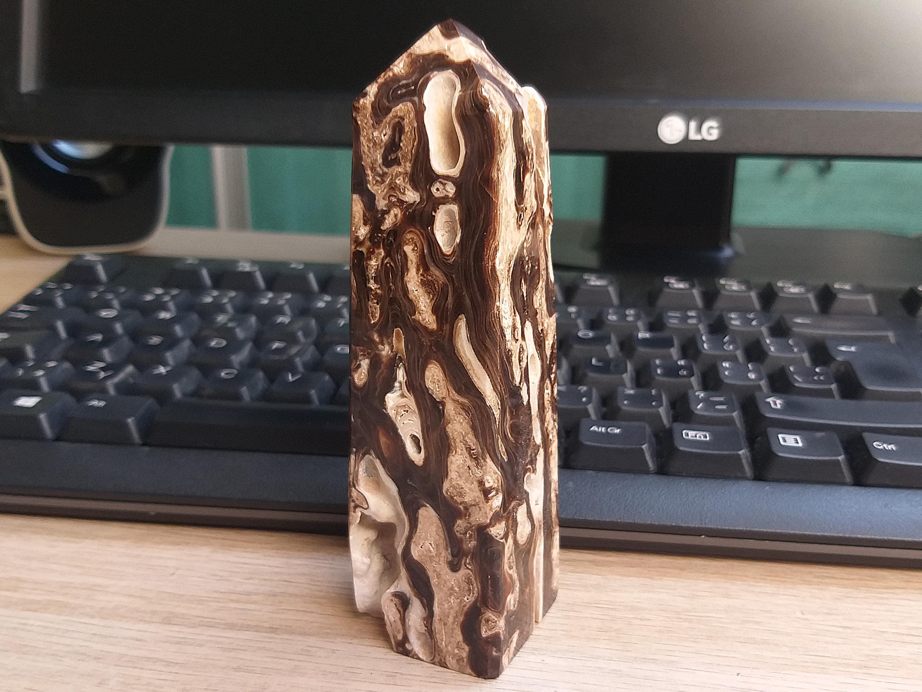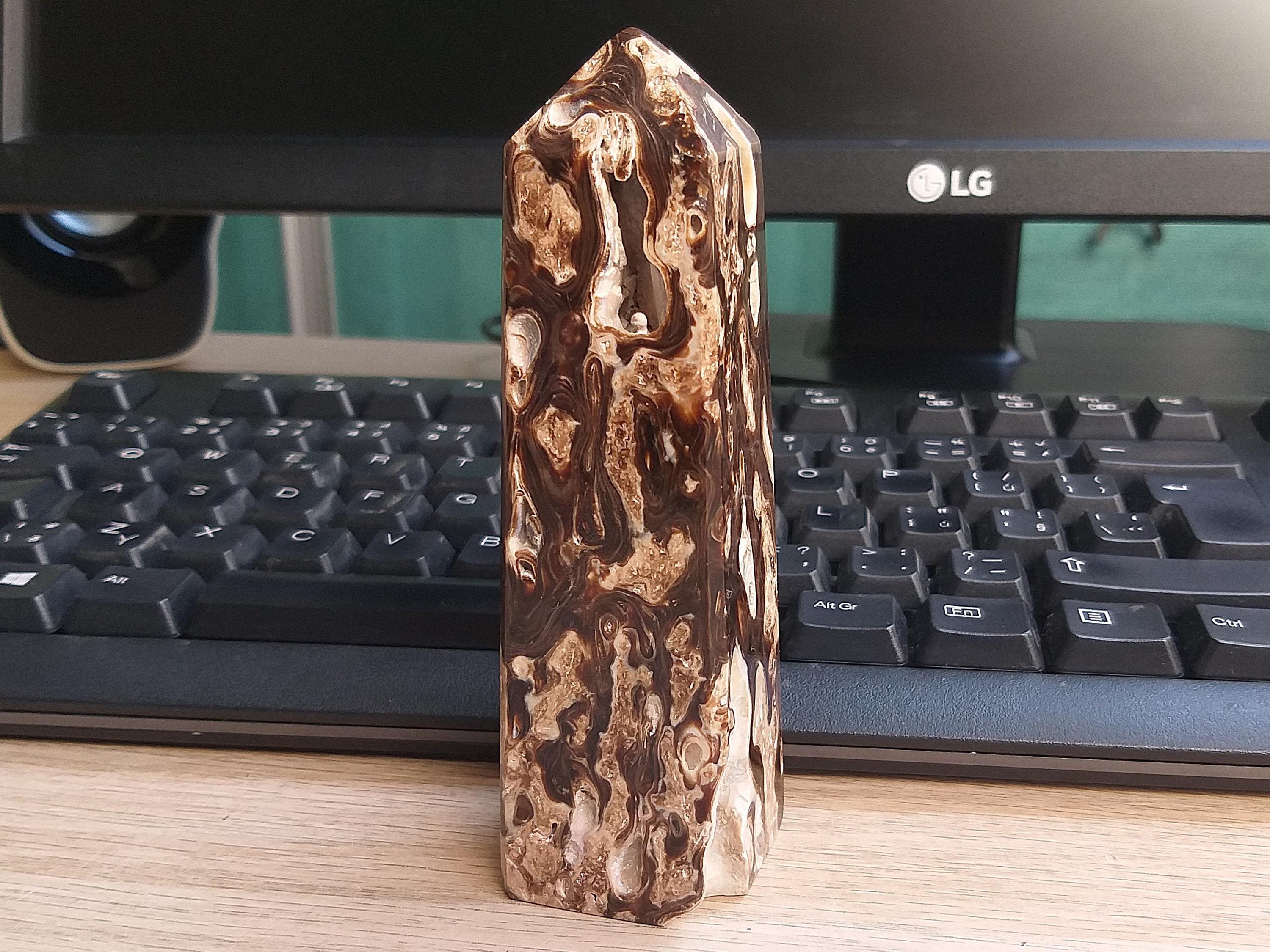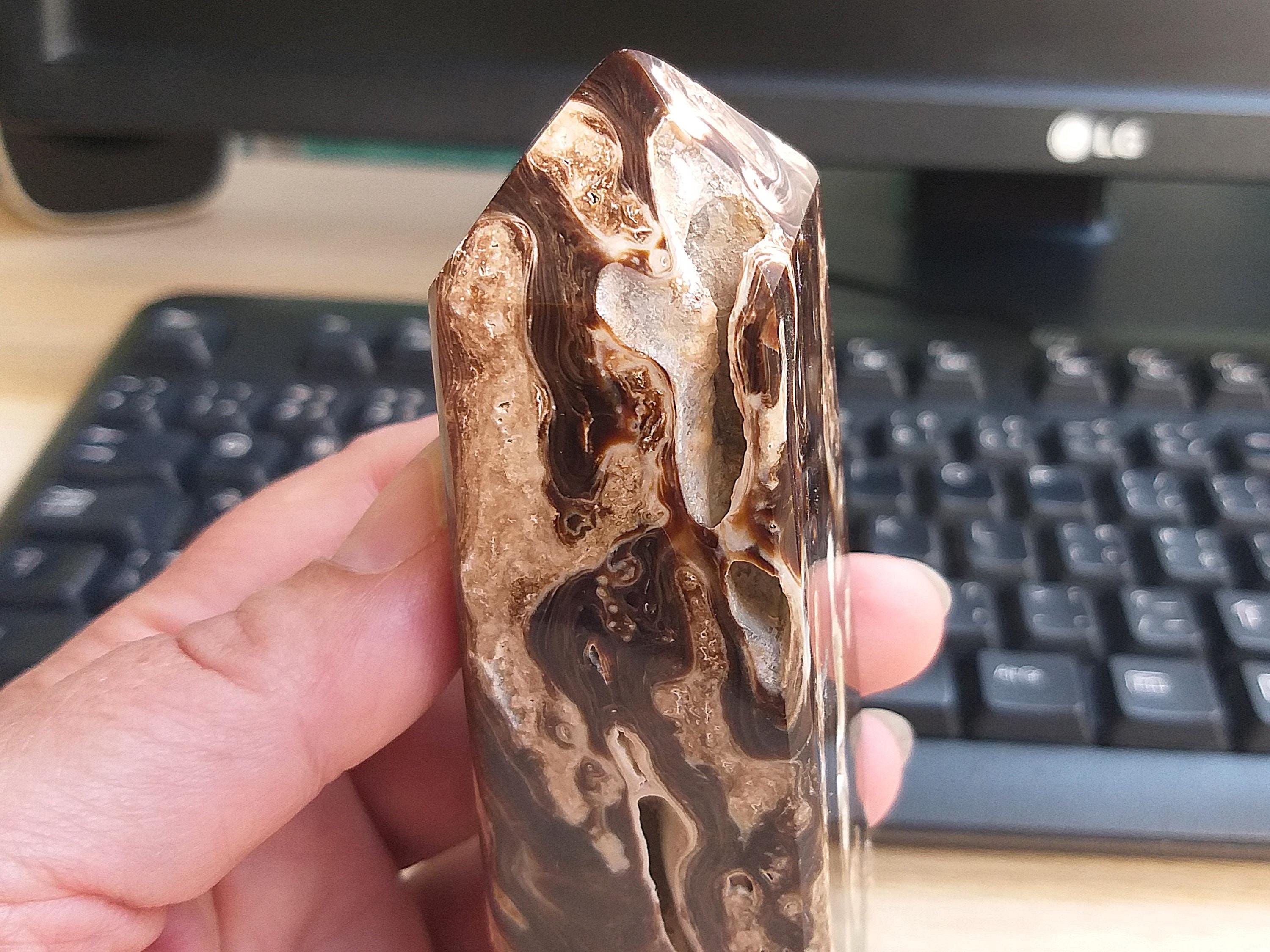 Origin: Pakistan Material: Chocolate Calcite with natural druses and geodes Size: approx. 125 × 35 × 35 mm Weight: 286 g Finish: Hand-carved, polished