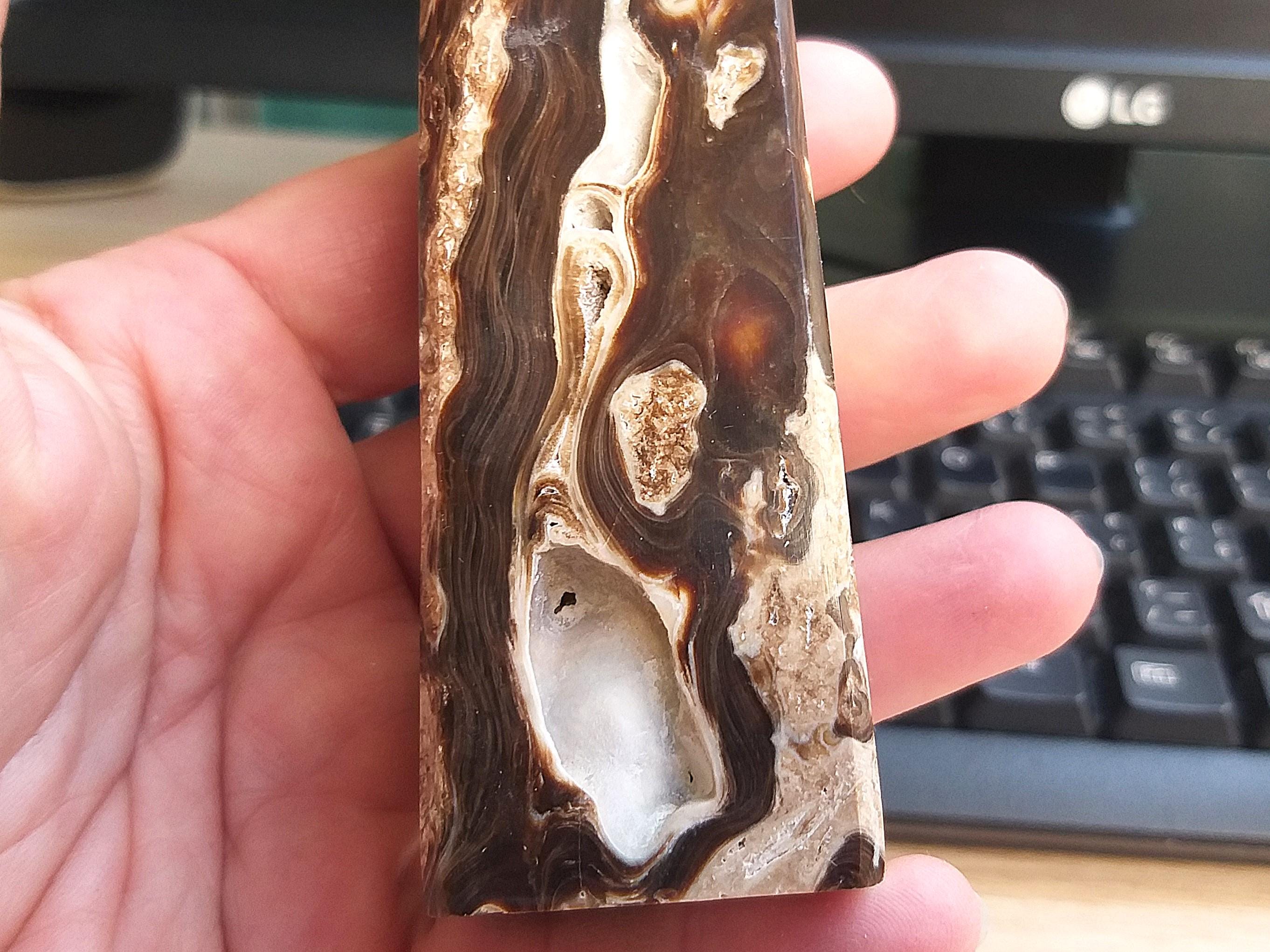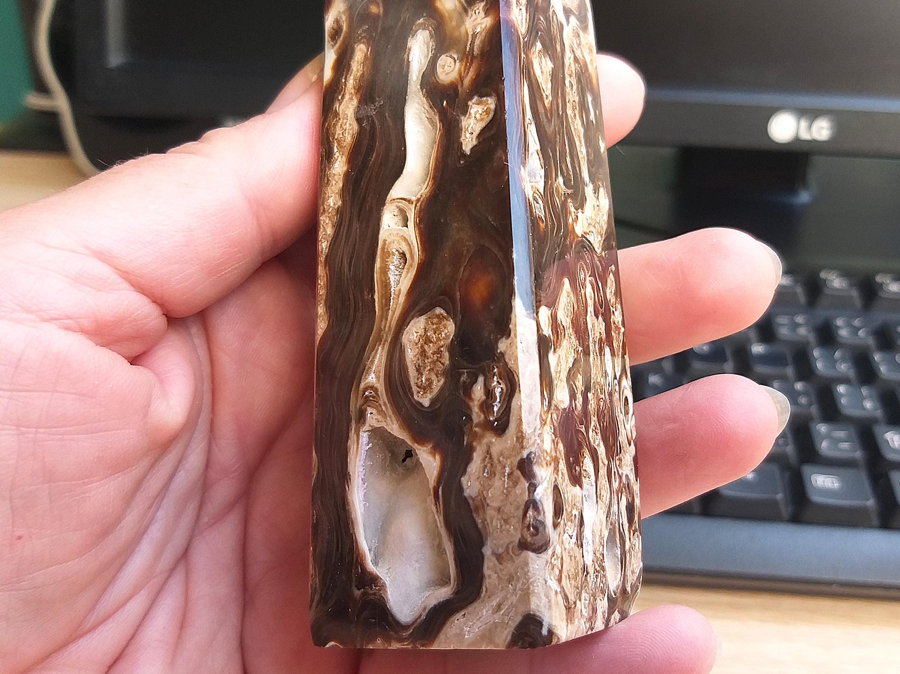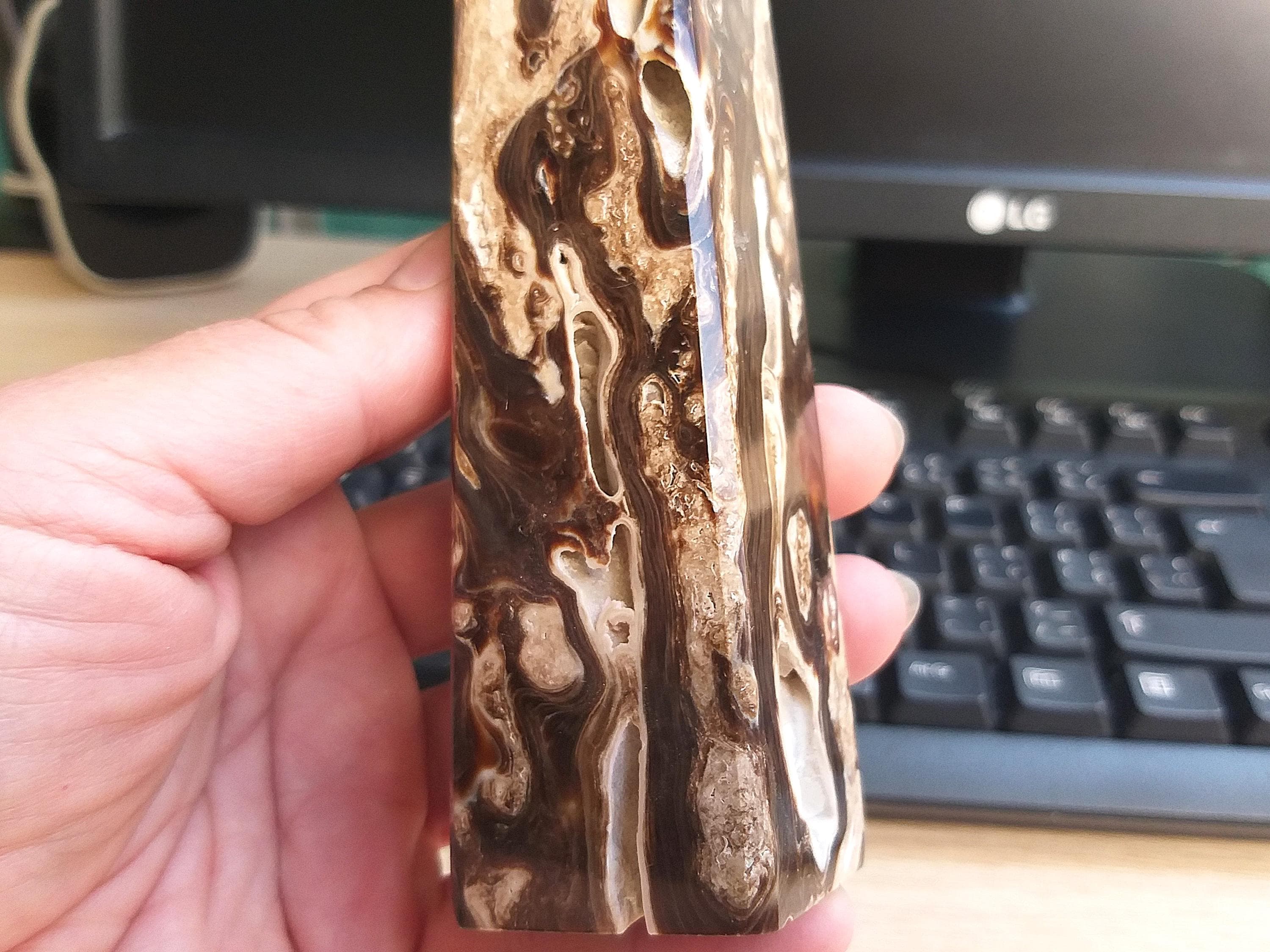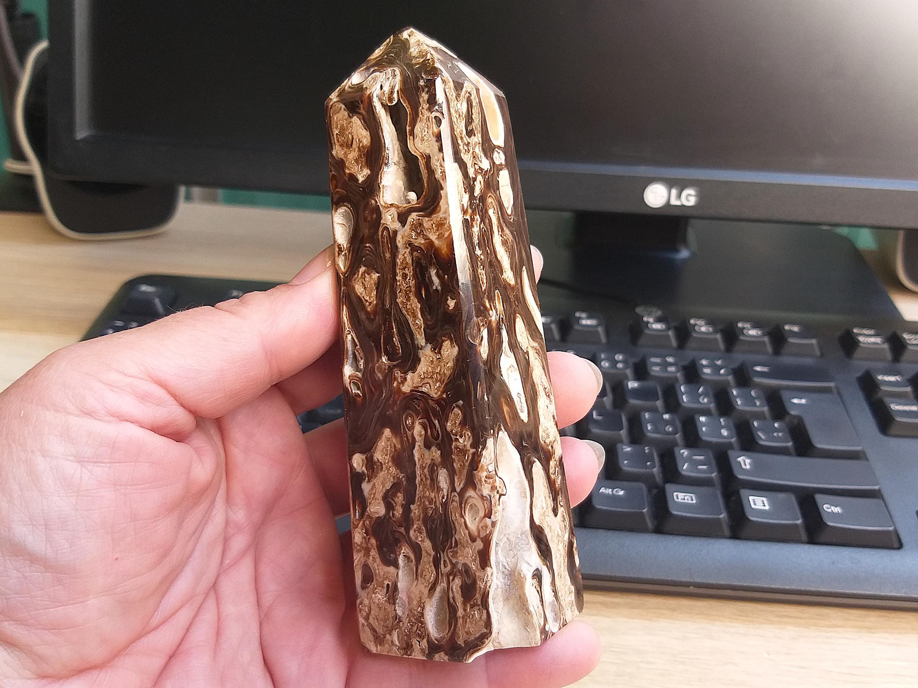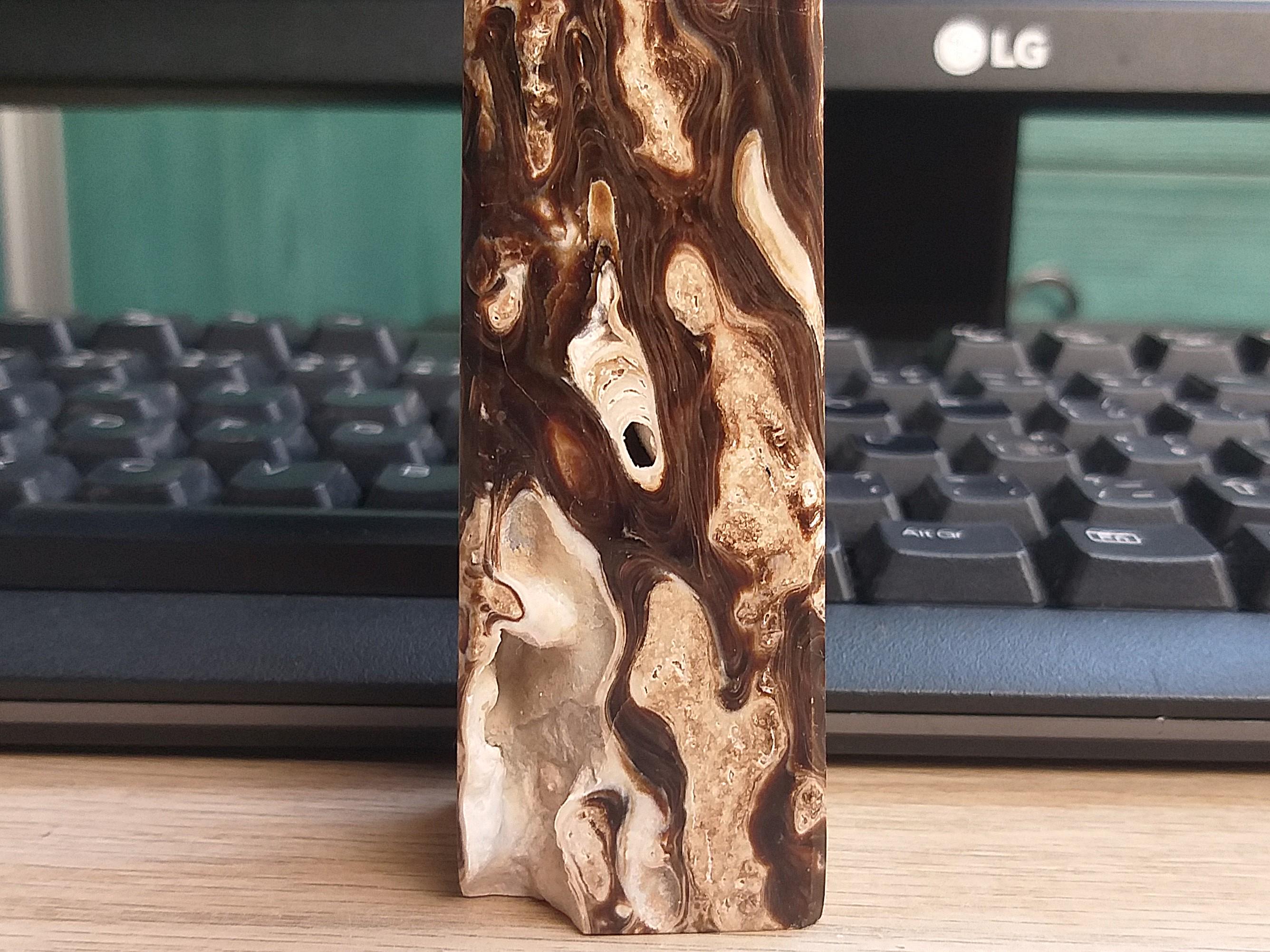 Origin: Pakistan Material: Chocolate Calcite with natural druses and geodes Size: approx. 125 × 35 × 35 mm Weight: 286 g Finish: Hand-carved, polished