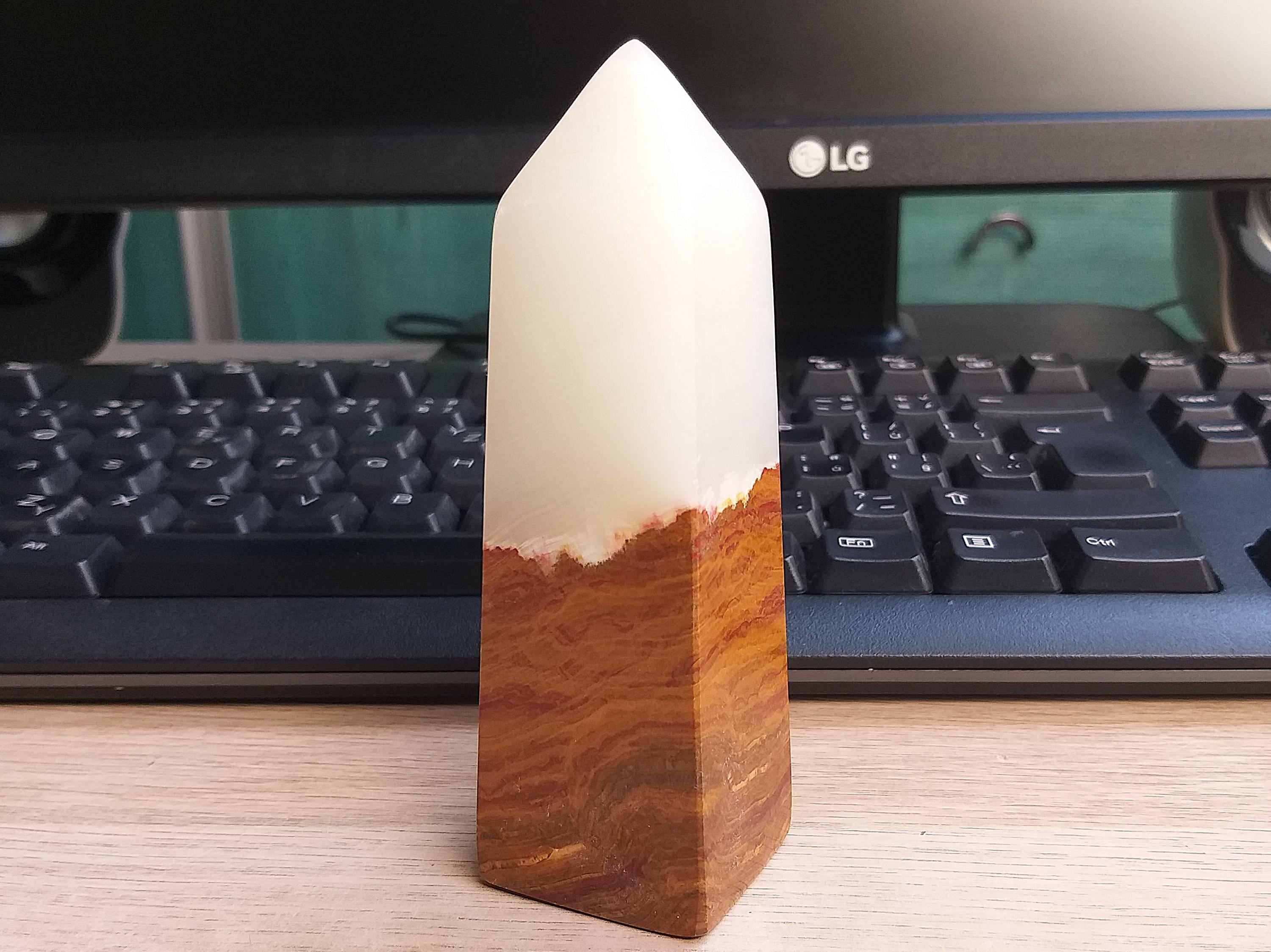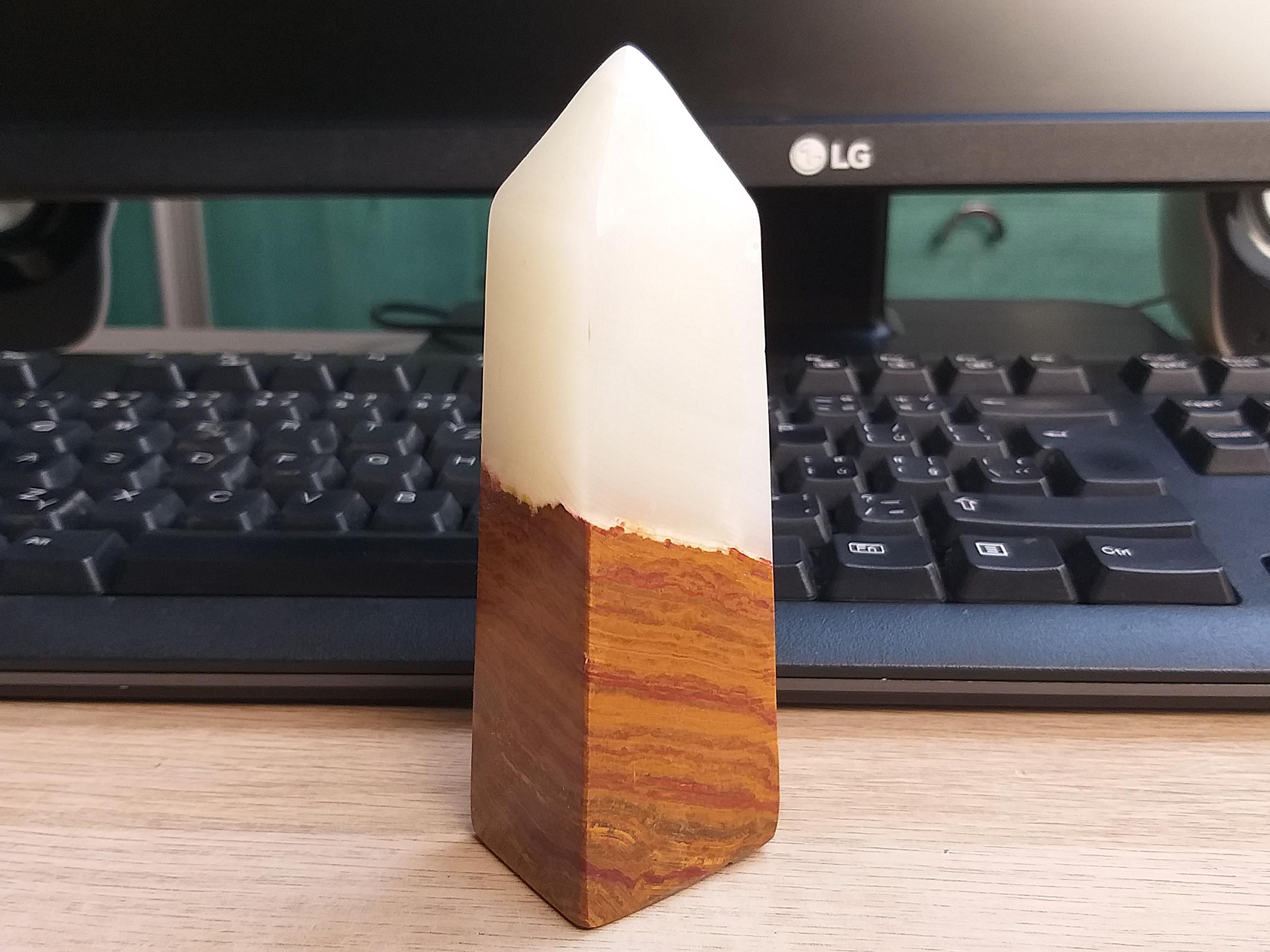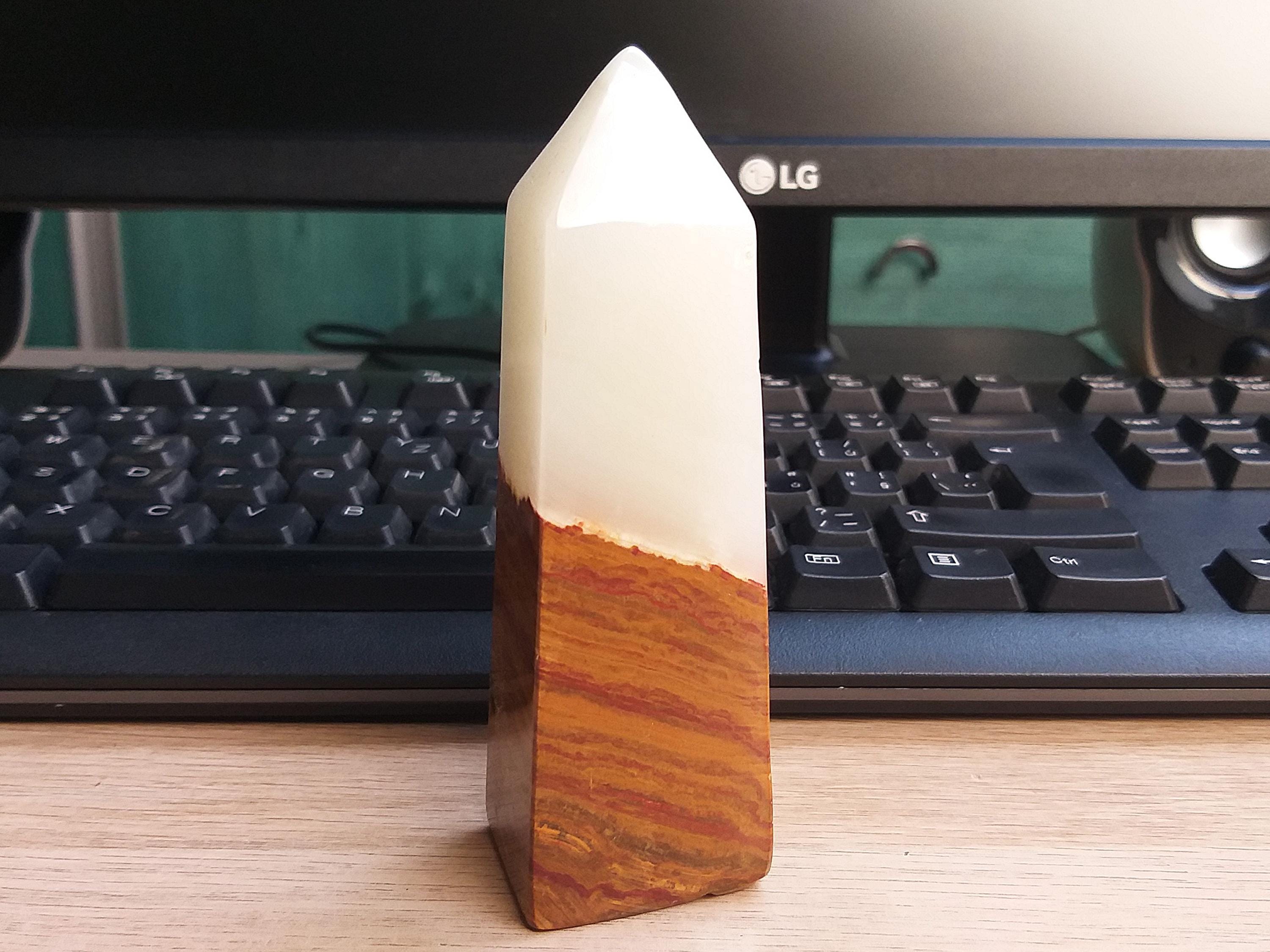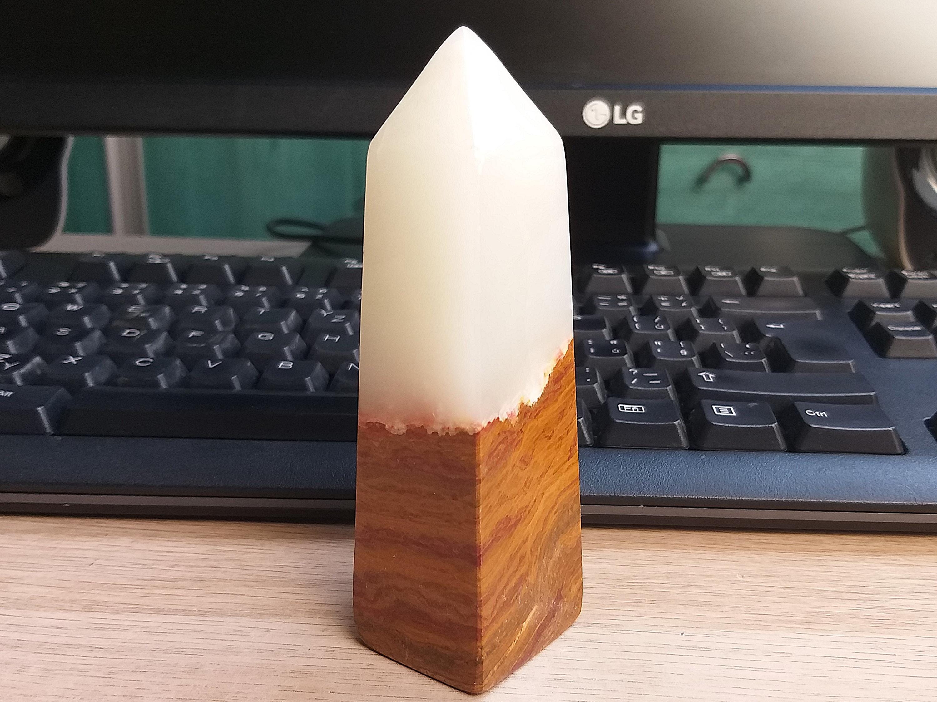 A sculptural fusion of light and texture—this Bicolor Calcite tower combines translucent White Calcite with richly grained Wooden Onyx Calcite, carved into a sleek obelisk.
