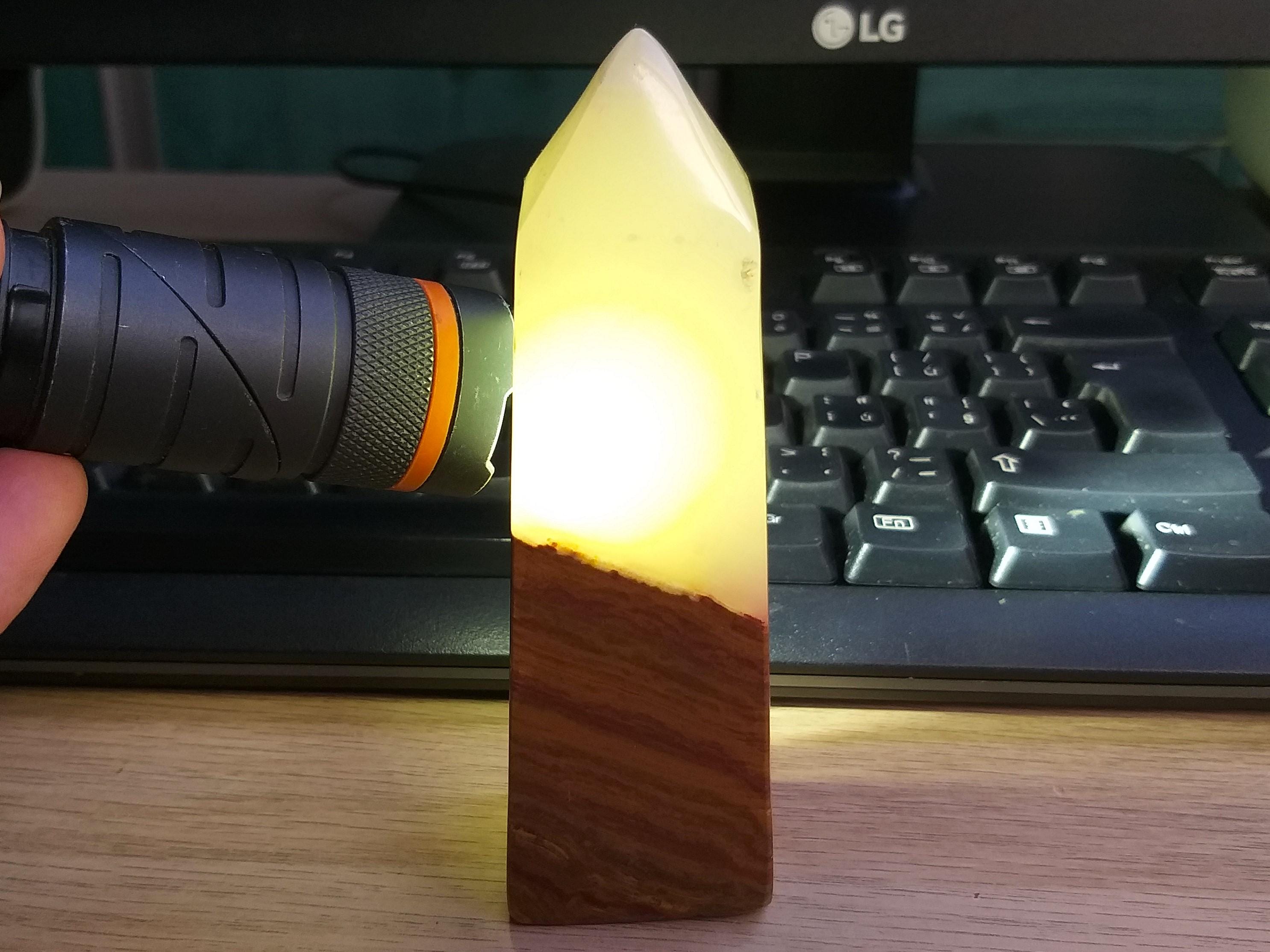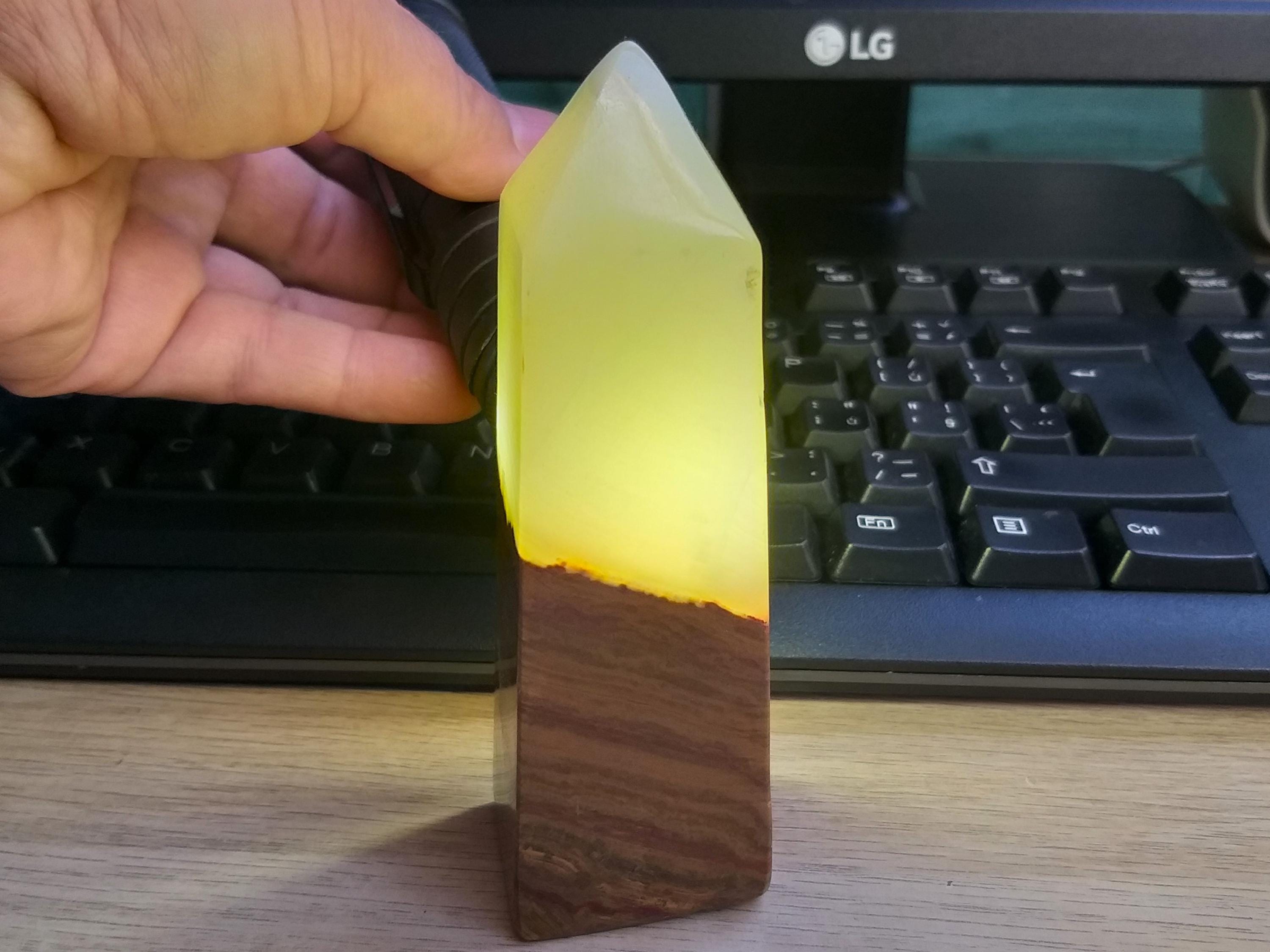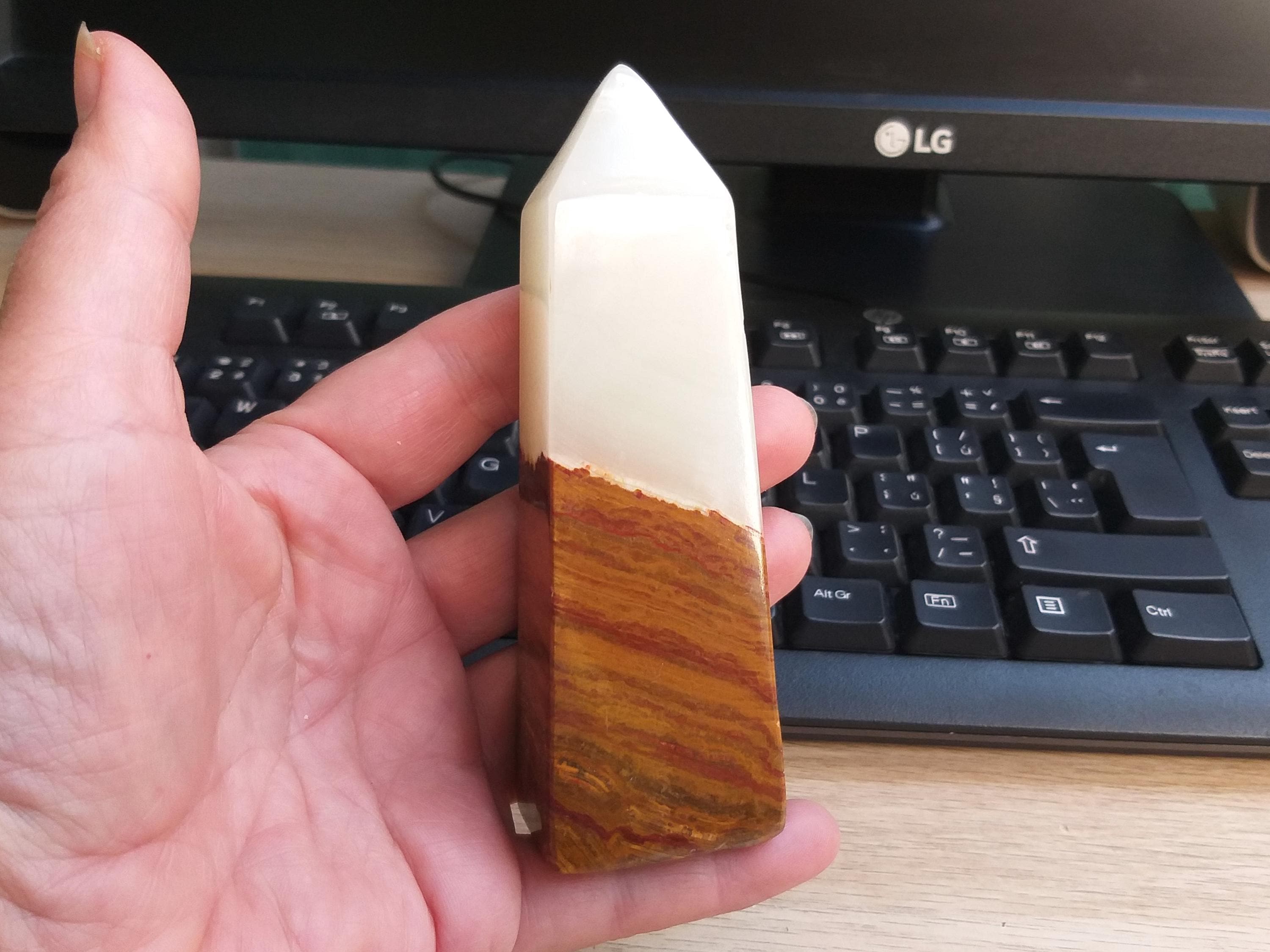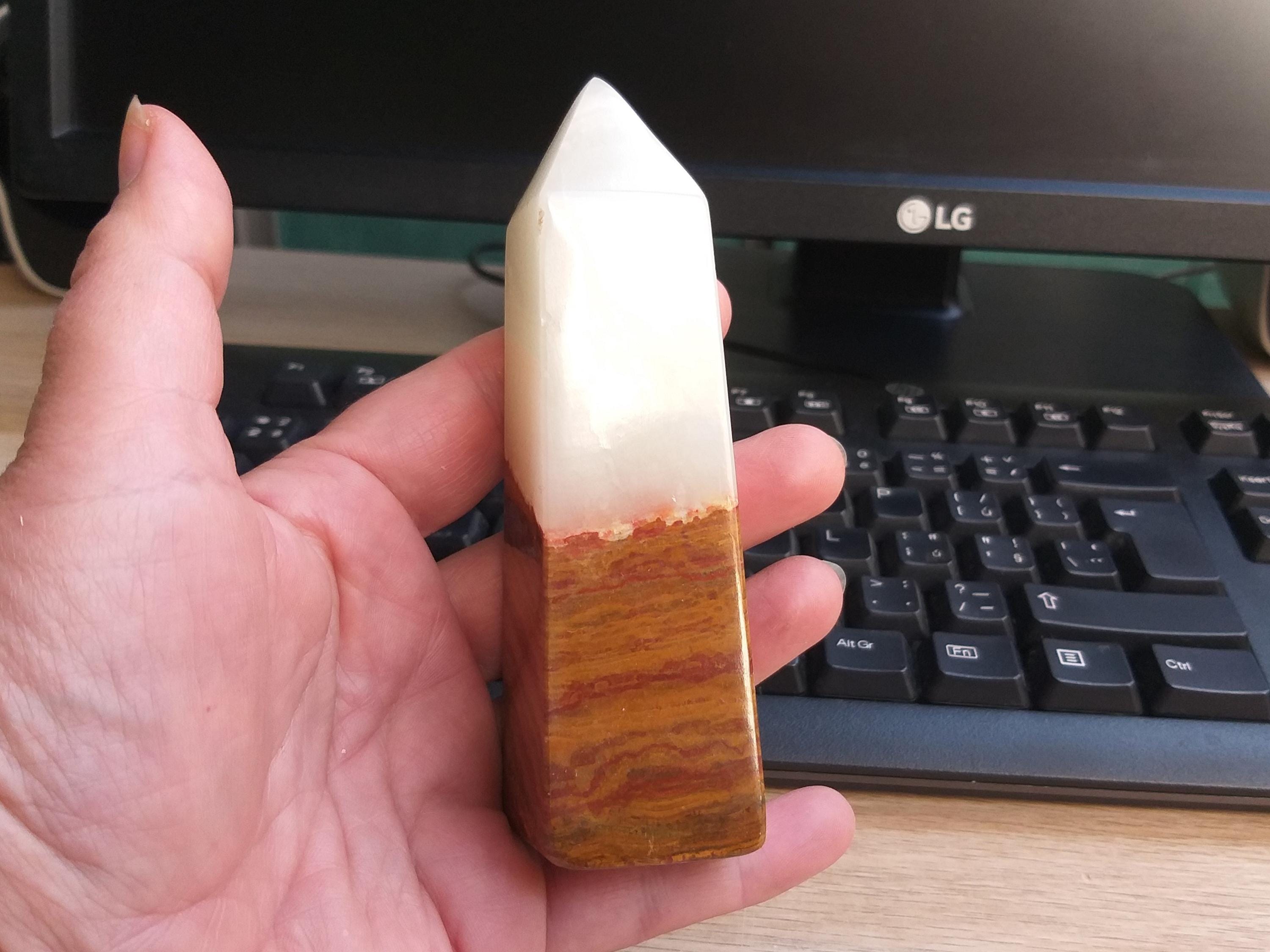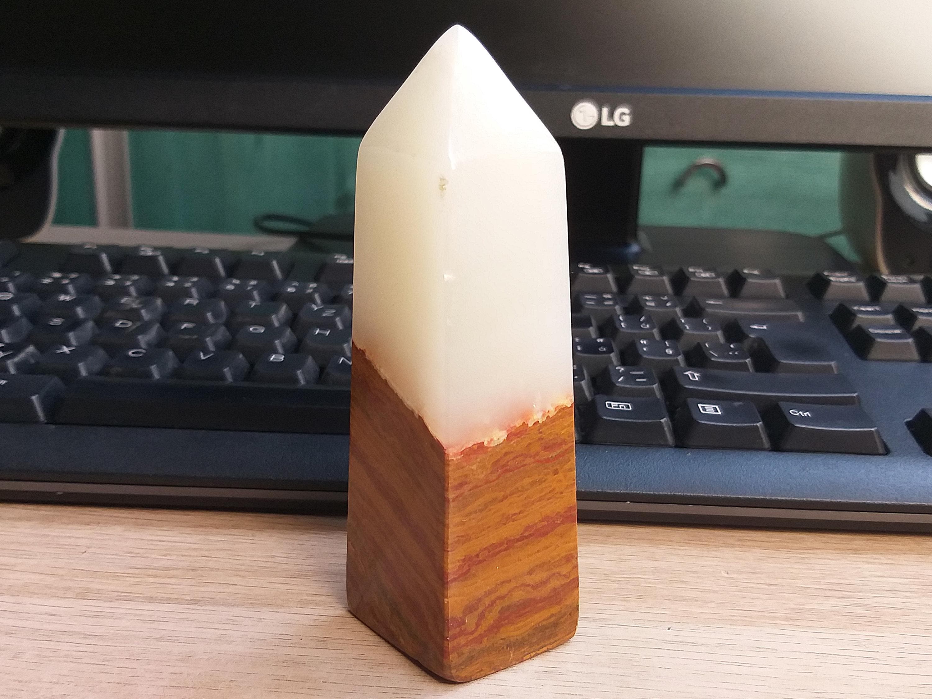 A sculptural fusion of light and texture—this Bicolor Calcite tower combines translucent White Calcite with richly grained Wooden Onyx Calcite, carved into a sleek obelisk.